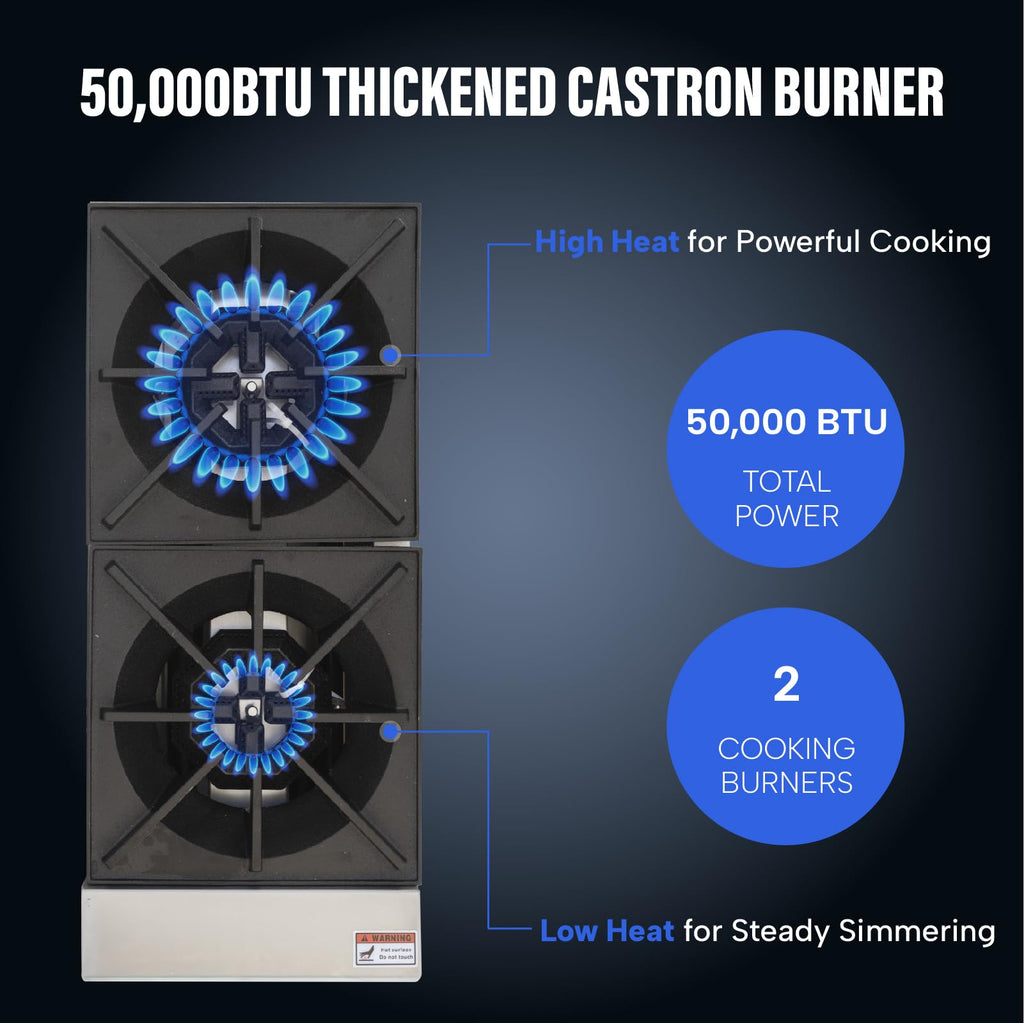 - High-Efficiency Burner System: Equipped with 2 high-efficiency burners, this stove allows for simultaneous cooking of multiple dishes. Independent flame control enables precise adjustment of both inner low flame and outer high flame, making it ideal for a variety of cooking styles. Compatible with both natural gas and propane, this stove meets the needs of commercial kitchens.