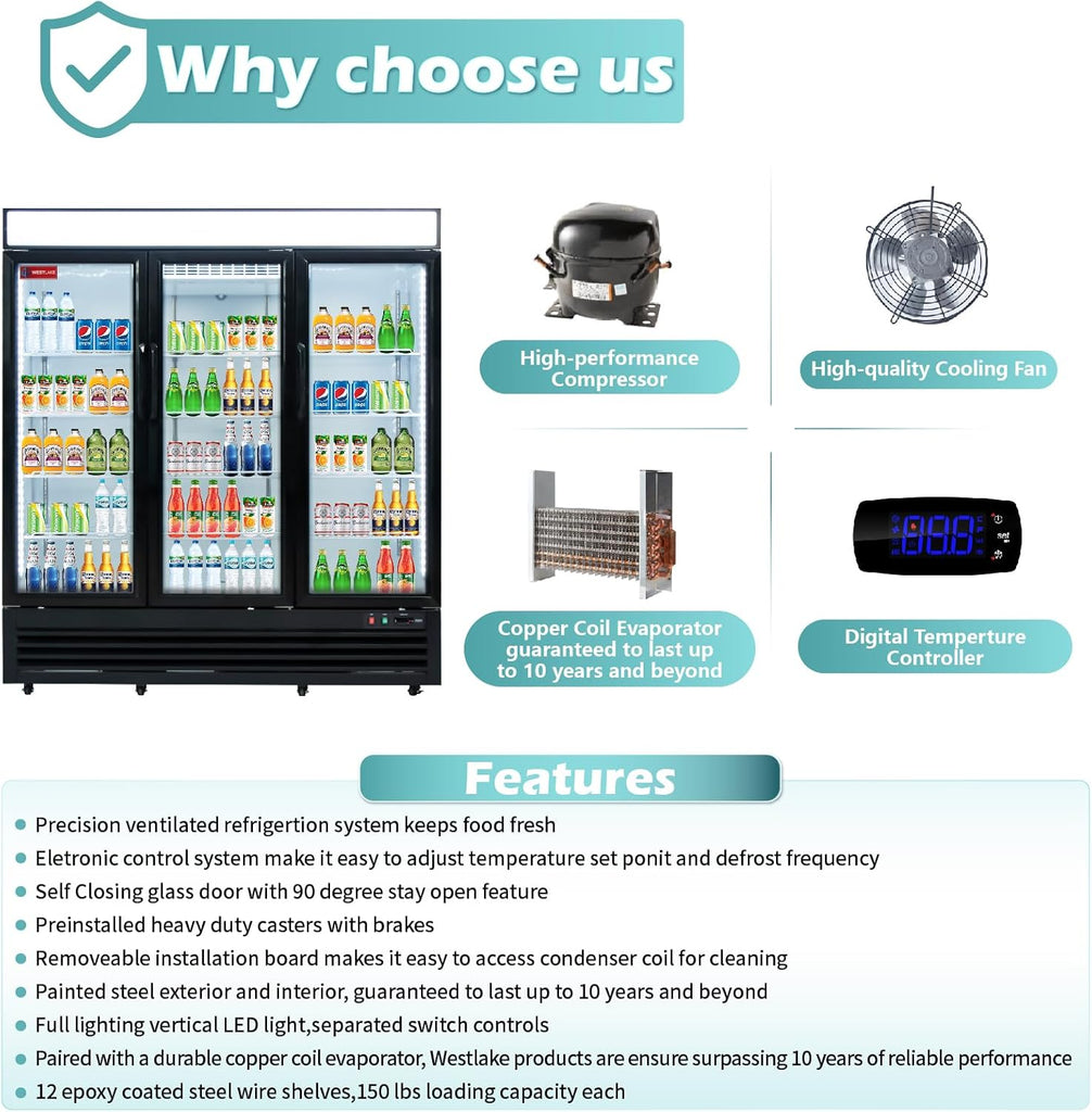 - Professional Build: 3-section reach-in design with auto-close & stay-open doors, 4 shelves (90 lbs load/shelf), and mobile 4″ casters.