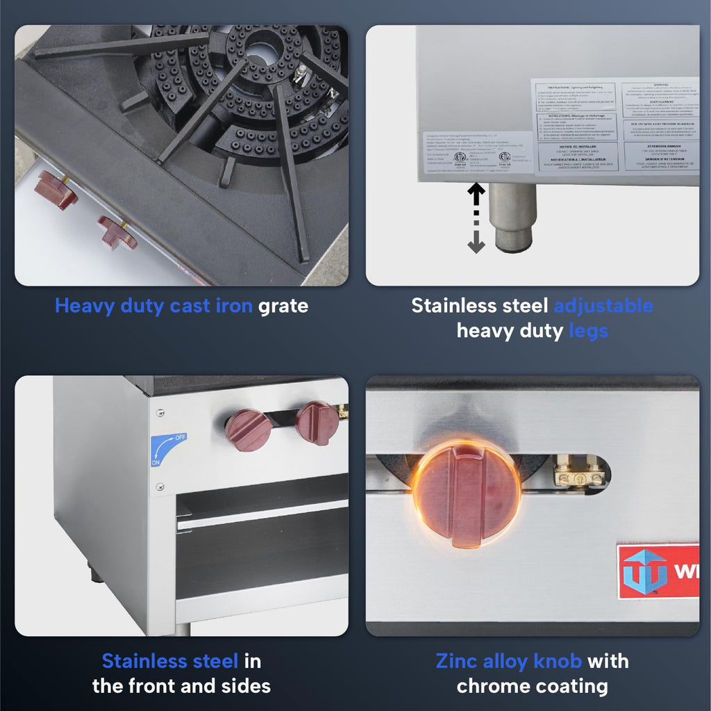 - Durable Stainless Steel Construction: The stove is made with heavy-duty stainless steel grates, designed to withstand the weight of large cookware in a high-intensity commercial kitchen environment. Heat-resistant knobs ensure safe and reliable operation even in high-heat conditions, extending the stove’s lifespan.