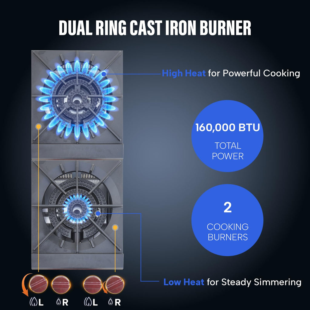 - High-Efficiency Burner System: Equipped with 2 high-efficiency burners, this stove allows for simultaneous cooking of multiple dishes. Independent flame control enables precise adjustment of both inner low flame and outer high flame, making it ideal for a variety of cooking styles. Compatible with both natural gas and propane, this stove meets the needs of commercial kitchens.