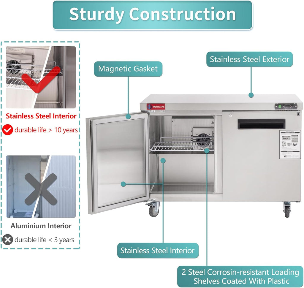- Stainless Steel Exterior and Interior: Constructed with all stainless steel material, our freezer is durable and easy to clean. The special exterior process prevents fingerprints, saving you cleaning time. The heavy-duty wheels with brakes allow for easy movement. Additionally, the freezer comes with 2 adjustable shelves, each with a load capacity of up to 90 lbs.