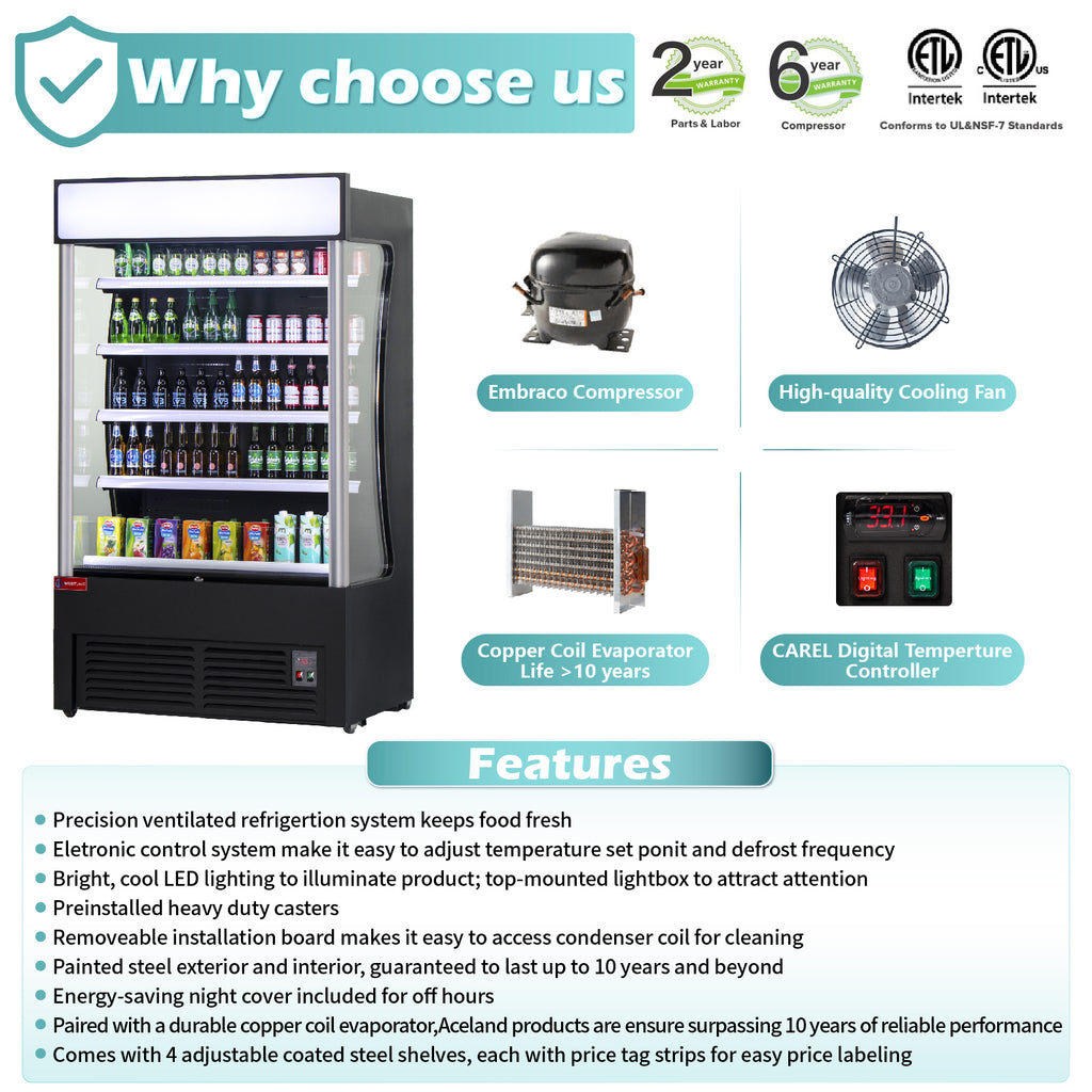 - Powerful compressor: Open Air Merchandiser with cubigel compressor, Carel controller, Fan cooling system, r290 refrigerant, automatically defrost, need no extra tube for condensing water. Cooler Temperature: 33℉~39℉(0.5℃~4.9℃), digital temperature control is convenient for you to set the temperature easily.
