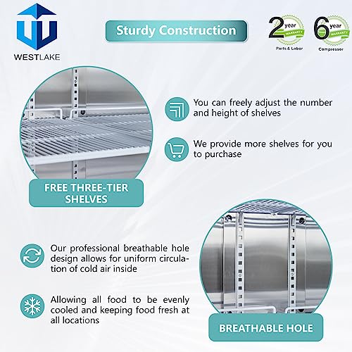 • Ultra-large refrigerator capacity: Food prep table equipped with 2 shelves and 8 shelf clips, allowing you to place your shelves exactly where you need them to accommodate your small or large food products. Shelves are coated with corrosion-resistant plastic, with a maximum loading capacity of 150 lbs.