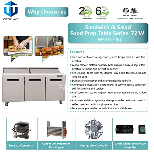 WESTLAKE Sandwich Prep Table Refrigerator 72 Inch Refrigerated Sandwich & Salad Station Fridge Cooler with 18 Pans.