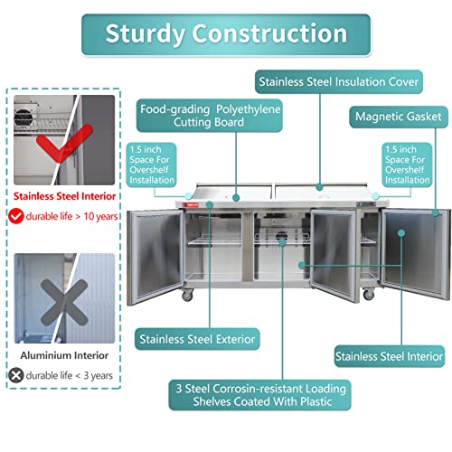 - Ultra-large refrigerator capacity: Food prep table equipped with 3 shelves and 12 shelf clips, allowing you to place your shelves exactly where you need them to accommodate your small or large food products. Shelves are coated with corrosion-resistant plastic, with a maximum loading capacity of 150 lbs.
