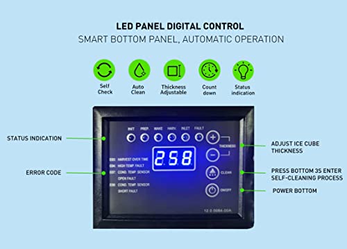 - Digital control panel and Intelligent voiced failure function system: The LCD digital display simplifies your operation to the greatest extent so that you can easily adjust the ice-making time and ice thickness; placed in loudspeaker controller board, the sensor transmits ice maker statements and notifies the user if any failure occurs.