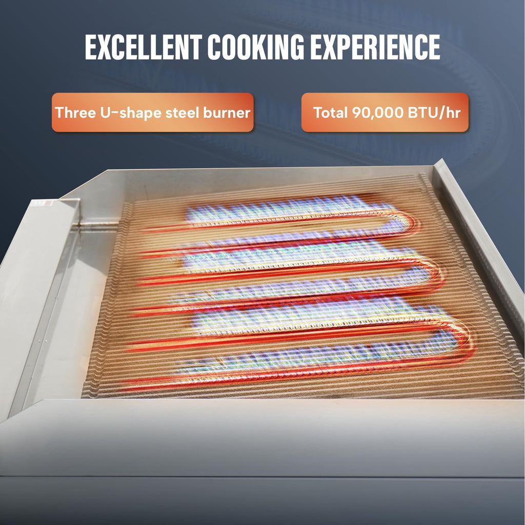 - High Heat Output & Even Heat Distribution: Powerful gas burners provide high heat output, ensuring efficient cooking and a perfectly charred exterior with a tender interior. The specially designed grates distribute heat evenly across the surface for consistent cooking results.