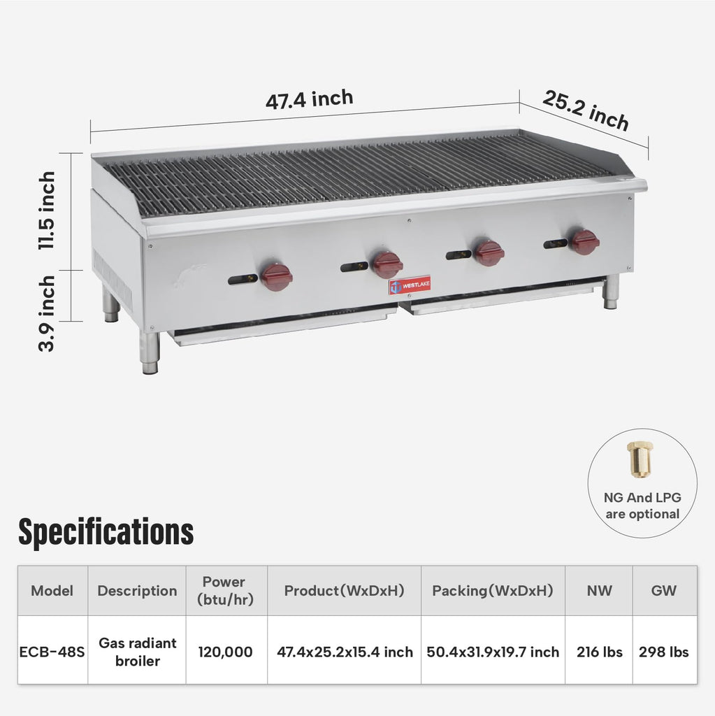 Commercial Charbroiler, WESTLAKE 48″ Gas Countertop Radiant Char Broil Barbecue BBQ Grill 4 Burner Char Broiler – 120,000 BTU